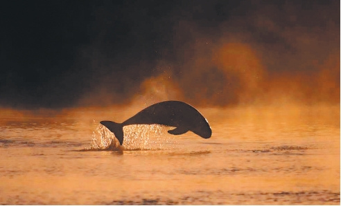 A Yangtze finless porpoise emerges from the water amid the morning mist in Poyang Lake, Jiangxi province, in Feb, 2021.