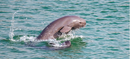 A Yangtze finless porpoise swims with a newborn calf in Yichang in 2023.